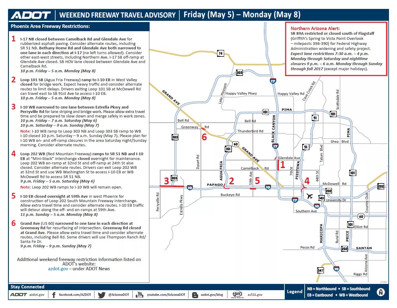 Complicating matters, ADOT says there will significant roadworks and detours and a number of busy freeways over the weekend. Most significant among them, parts of northbound Interstate 17 and parts of the I-10/Loop 202/Route 51 “Mini Stack” will be closed on Friday night.