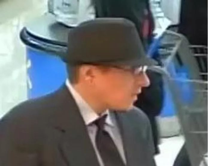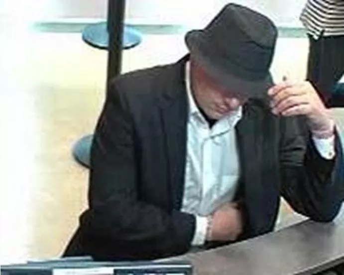 He wears dress clothes, a black fedora, and glasses. In each case he enters a store with a bank branch and hands the employee a note demanding loot.