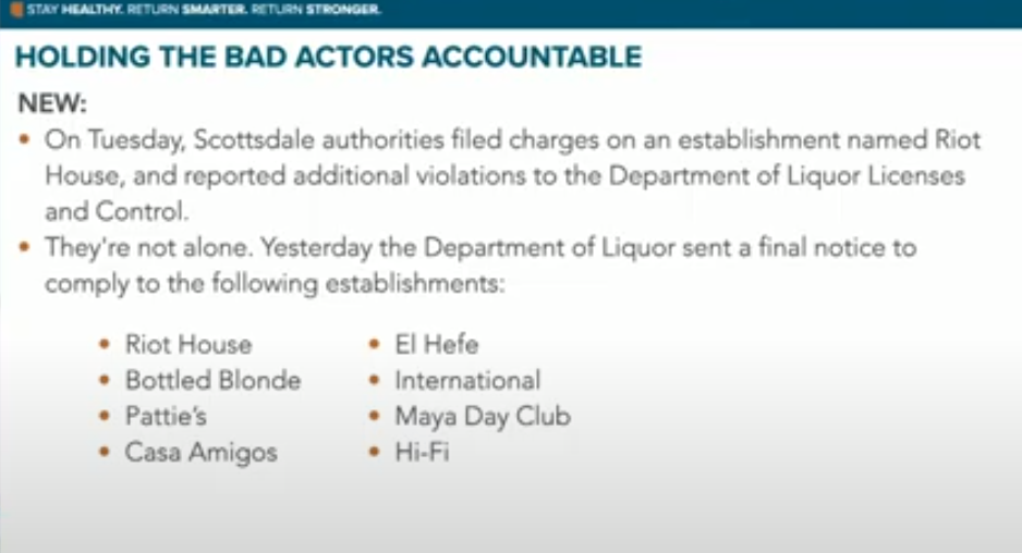 While the governor is not taking new executive action, he shared a list of eight businesses – called “bad actors” in a PowerPoint slide – getting a final warning from the state liquor board regarding their lack of following social-distancing guidelines.