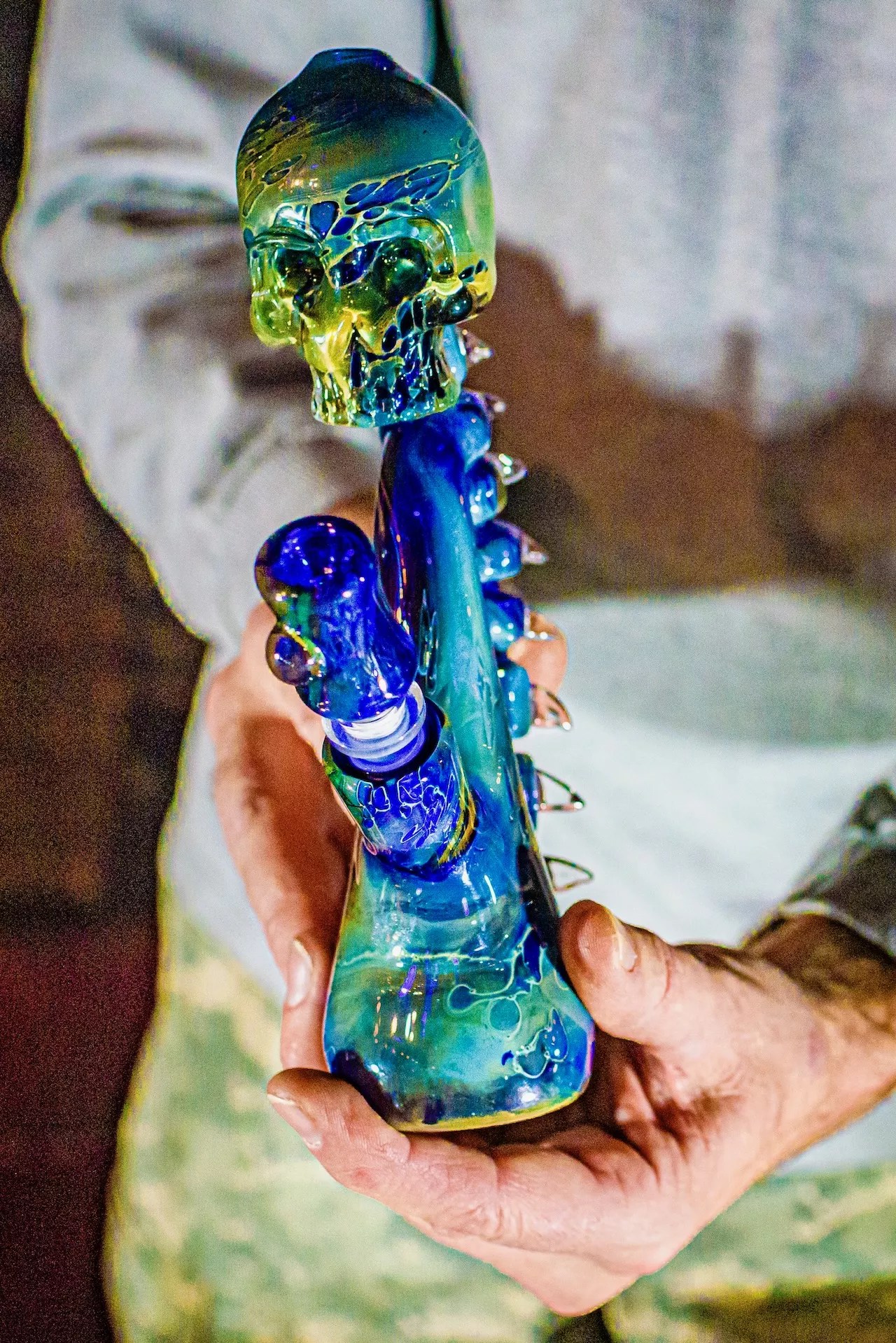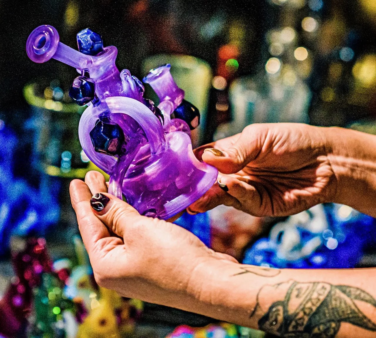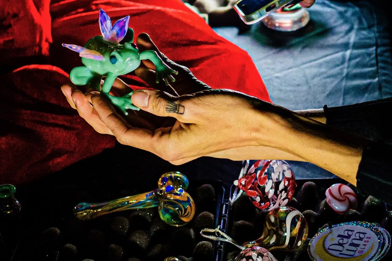 A patron holds a piece crafted by Chase Sawicka of Chasesglass.