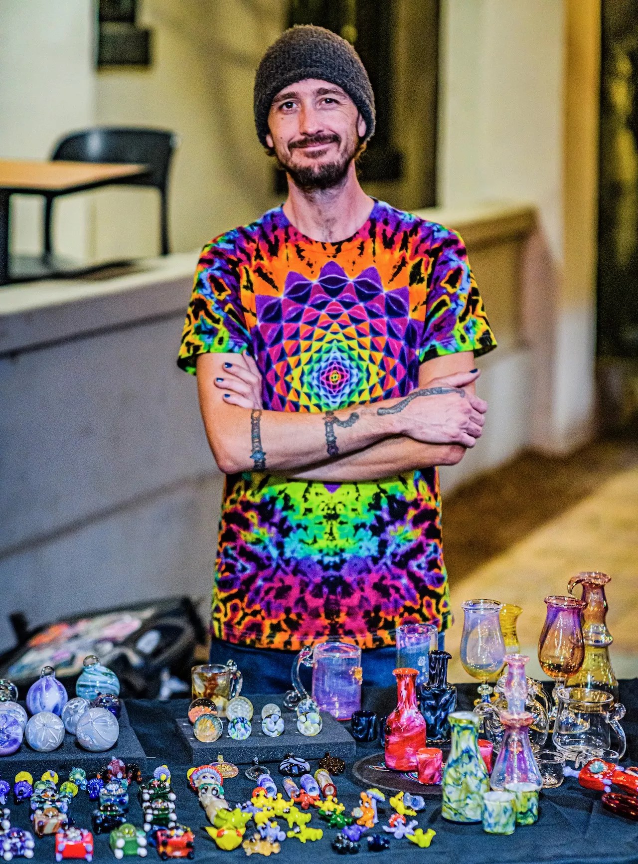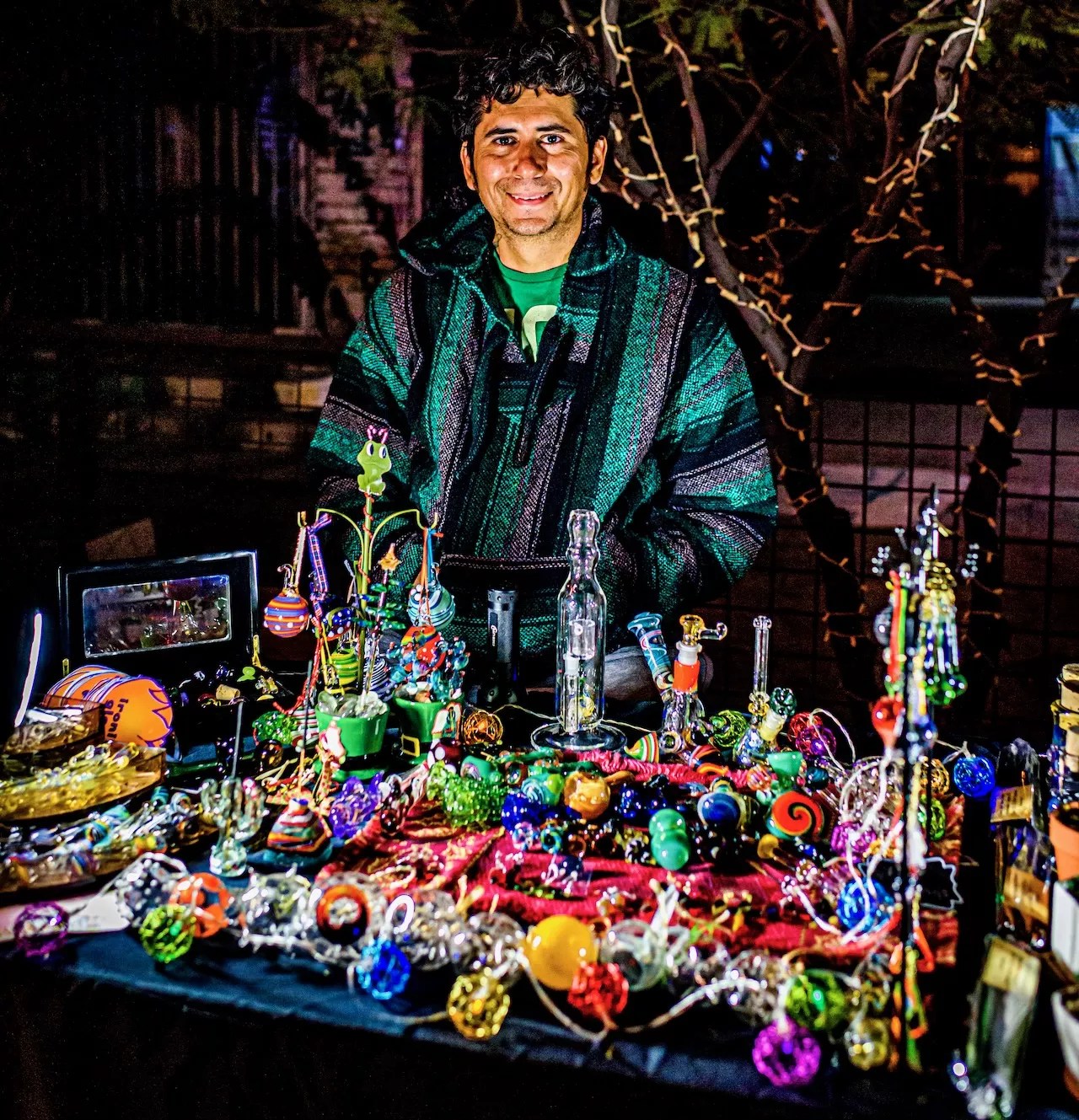 Luis Campos of Ironik Glass poses with his glasswork for sale.
