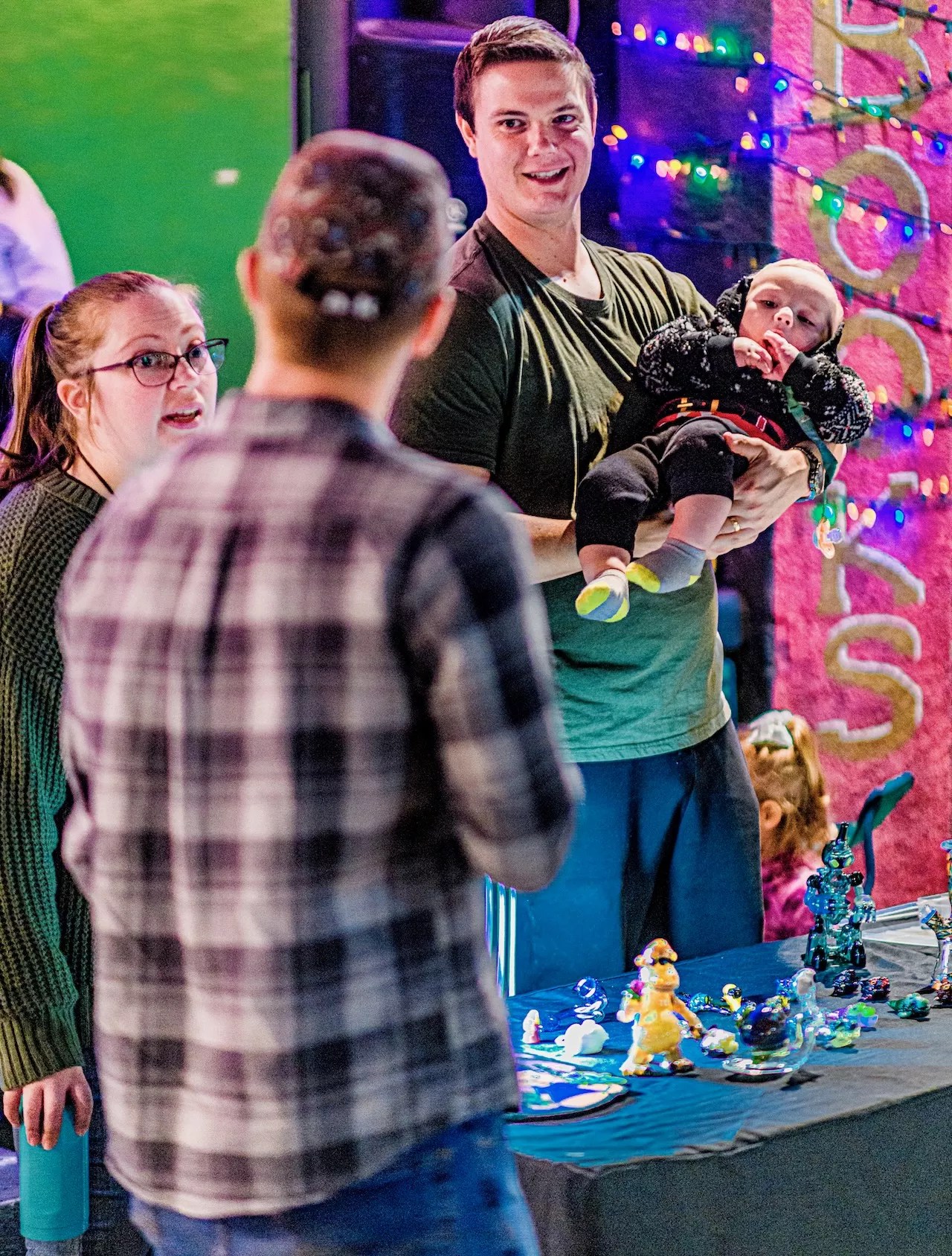Steve Hulsebos of SteveHGlass holds his 8-month-old child, Cameron, while he and his wife Christiana talk to a patron.