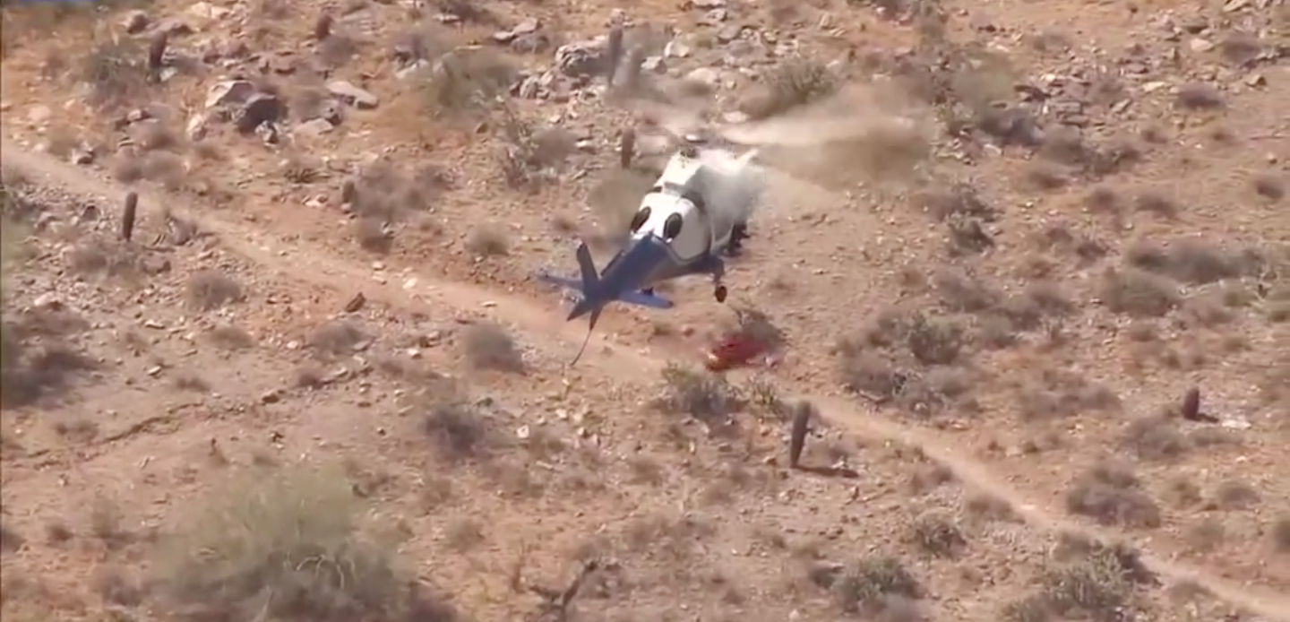 Katalin Metro spins violently while attached to the helicopter.