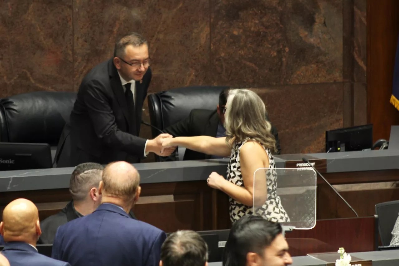 House Speaker Ben Toma greeted Gov. Katie Hobbs before she delivered her State of the State address on Monday.