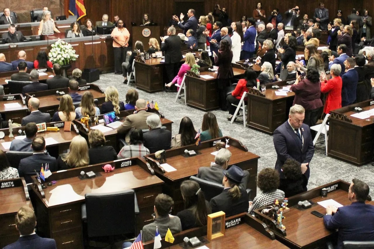 Arizona lawmakers brought family, friends, colleagues, mentors and other guests onto the House floor on Monday to mark the opening of the second session of the 56th Legislature. The festivities concluded with Gov. Katie Hobbs delivering her State of the State address.