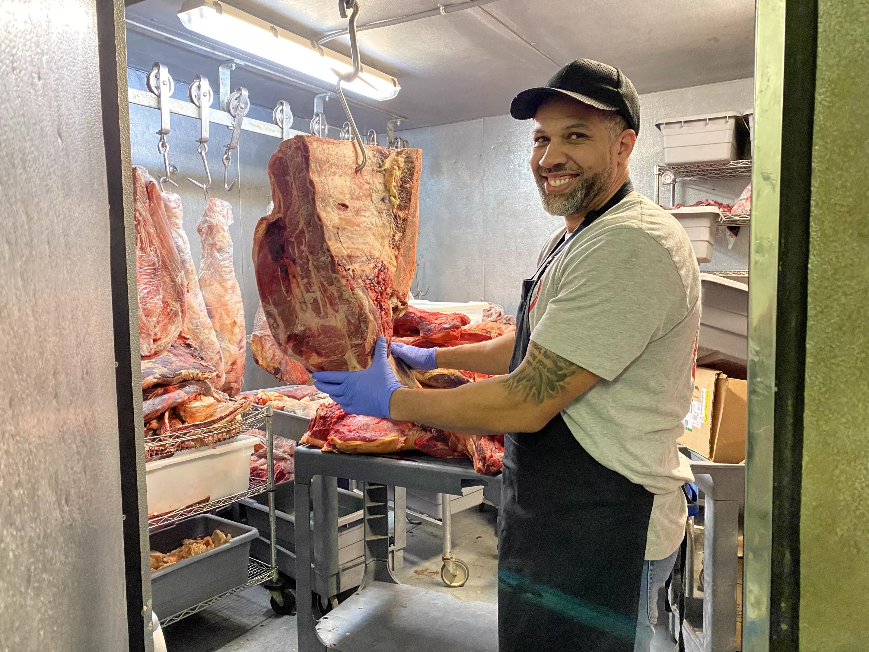 The Meat Shop, a Phoenix institution, is creating custom foot-long hot dogs for the Super Bowl Experience. Manager David Grant examines a side of beef they’ll use for their creations.