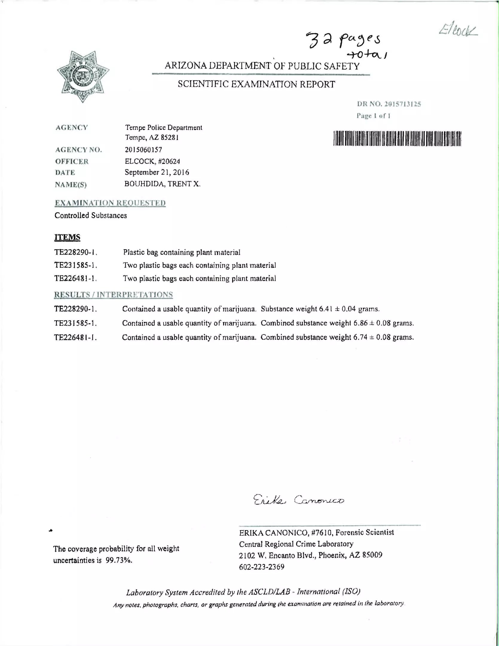 The trial lasted a little over a week. The verdict came down on the Monday after Thanksgiving. An inevitable parade of 12 jurors read off a guilty verdict on each count. It was, Bouhdida said, like “watching my fate through a glass.” The lab report on the small amounts of “plant material” that Bouhdida sold Elcock. Maricopa County Superior Court trial exhibit