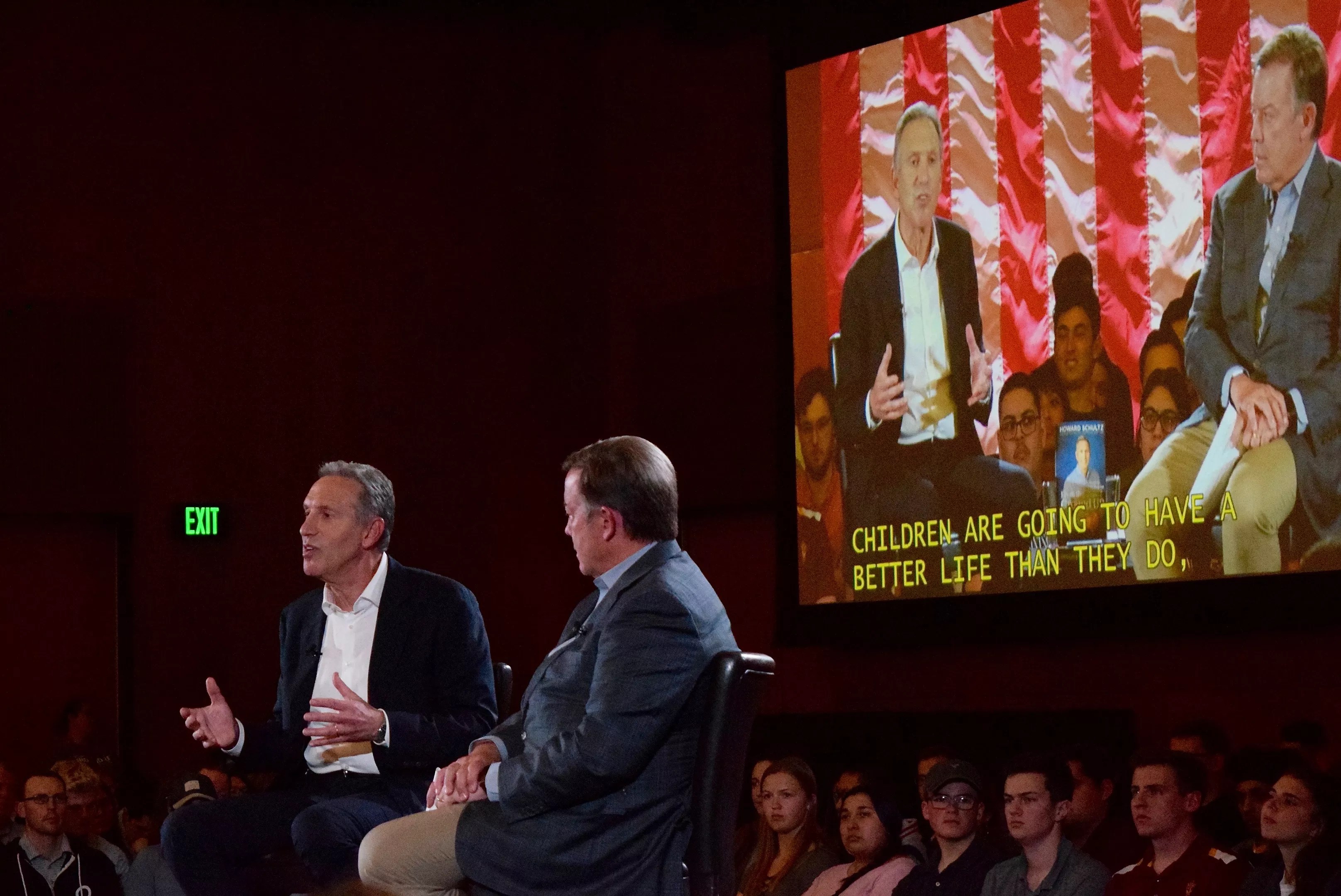 Whether Schultz decides to run, he looked and sounded a lot like a presidential aspirant during his talk with Crow. Projector screens in the hall displayed a hashtag, #ReimagineUS. An American flag was draped over the back wall of the pavilion hall behind Schultz and Crow, in clear view of the television cameras.