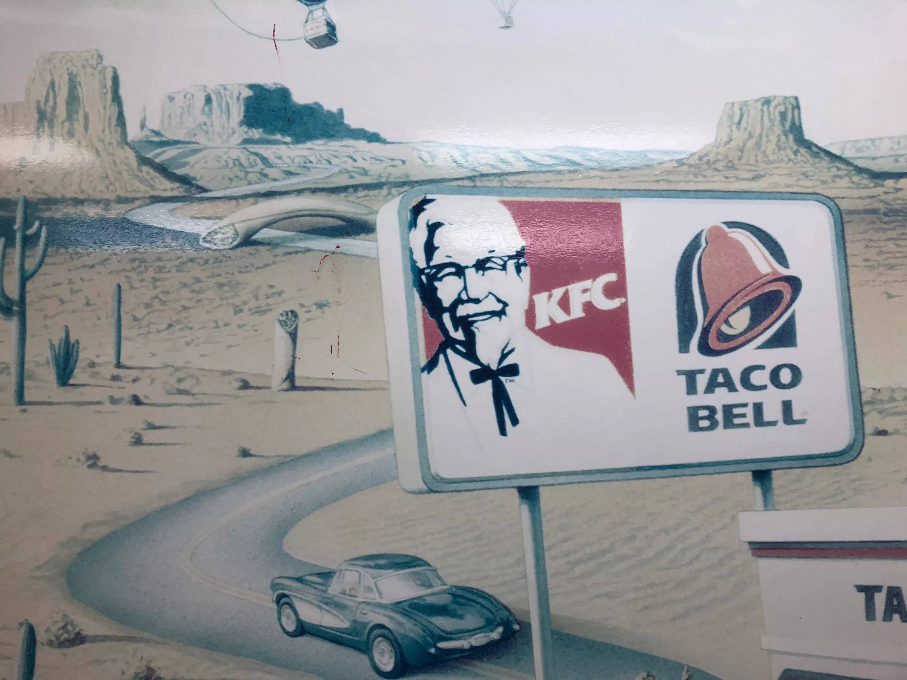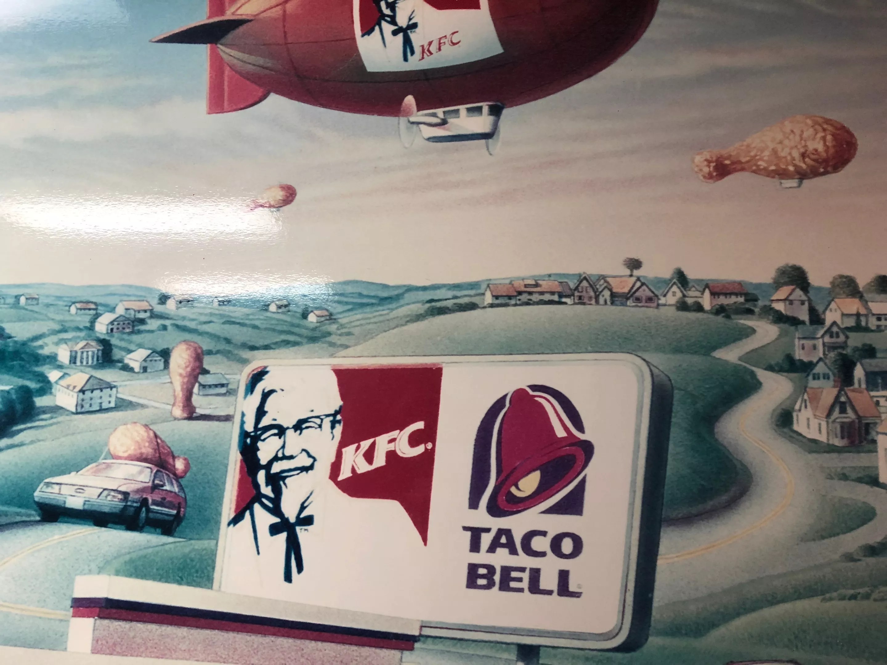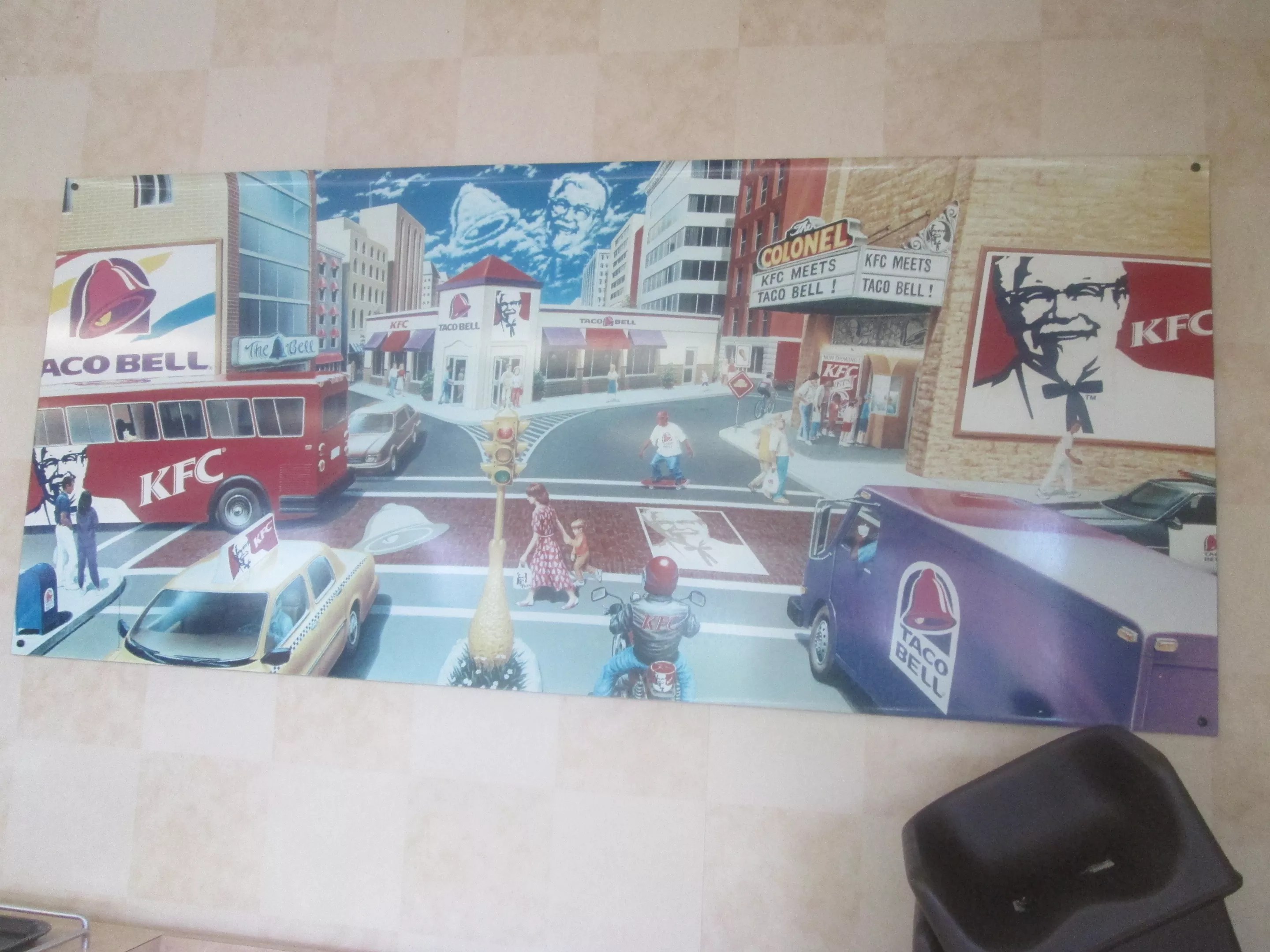 Five years ago, my friend Kate Erickson sent me a photo of a piece of artwork that she’d spotted on the wall of a combination KFC-Taco Bell in Billerica, Massachusetts. Since then, I have thought about it approximately once a week. The mural, which takes up the better part of a wall, is a richly detailed masterpiece celebrating the confluence of American fast-food culture that can be found at your neighborhood KFC-Taco Bell outpost.