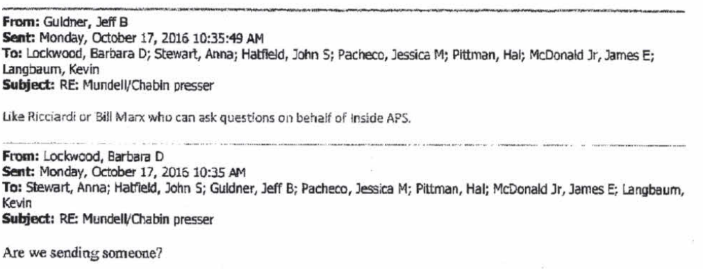 That October, it was Guldner who suggested that APS plant two of its writers at a press conference hosted by Democratic Corporation Commission candidates Bill Mundell and Tom Chabin, “who can ask questions on behalf of [internal newsletter] Inside APS.”