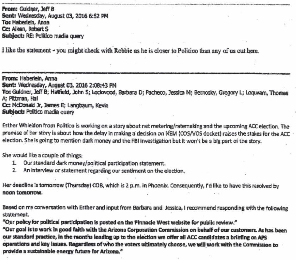 Haberlein took her query to Guldner, among others, suggesting that APS give the Politico reporter a statement that she, Pacheco, and VP of Regulation Barbara Lockwood had devised.