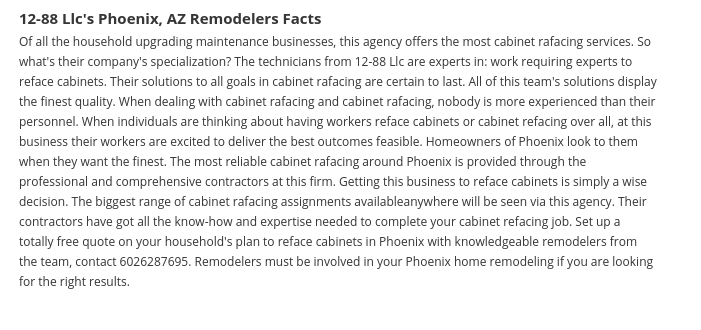 Those profiles still exist today, with one revised as recently as September 2018. When New Times dialed the 602 number listed for 12-88 LLC on eHardHat.com, no one answered, but the voicemail went to someone named Jeff.