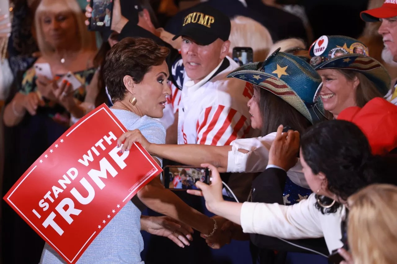 Kari Lake greets supporters during an event with former President Donald Trump at the Mar-a-Lago Club on April 4, the same day Trump pleaded not guilty in a New York courtroom.