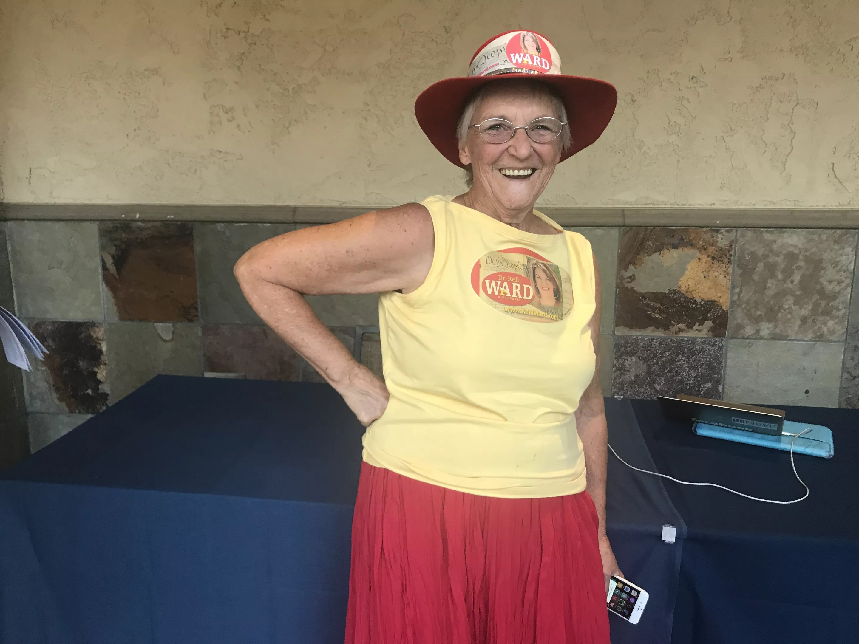 Clad in a homemade Kelli Ward T-shirt and cowboy hat, the Vail, Arizona, resident helped pass out a petition to get Ward on the ballot. She said that she likes that Ward talks the same way on the stump as she does in person.