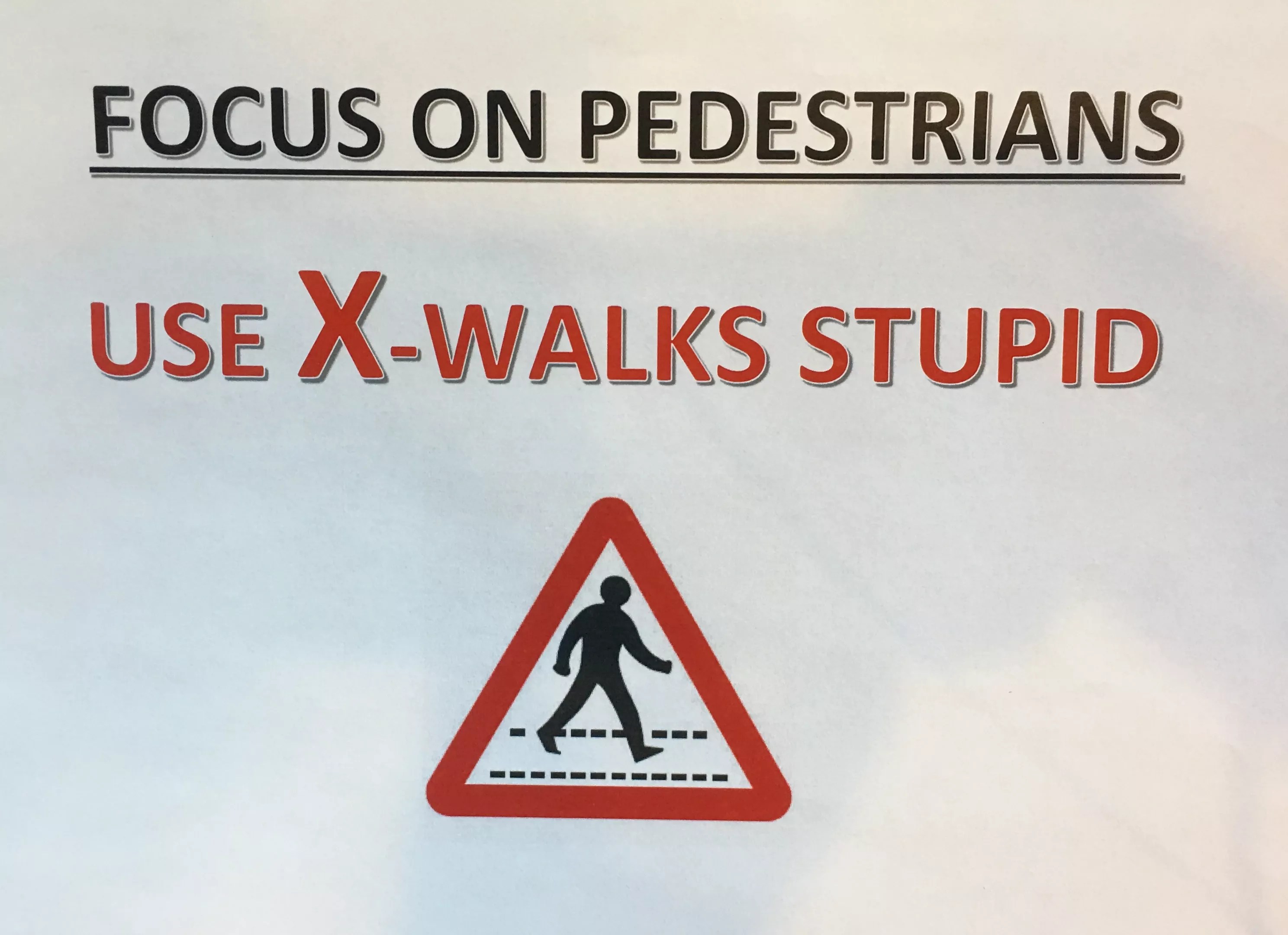 “USE X-WALKS STUPID,” it blares in bold red letters.