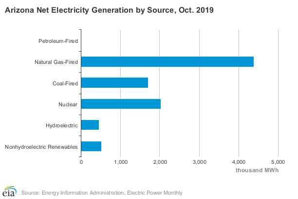 Arizona generates the majority of its electricity from natural gas and nuclear energy.