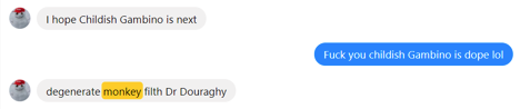 In another chat, Thomas appears to refer to the rapper Childish Gambino, who is black, as “degenerate monkey filth.” Thomas is apparently speaking with Darian Douraghy, one of the former members who wrote the dossier.