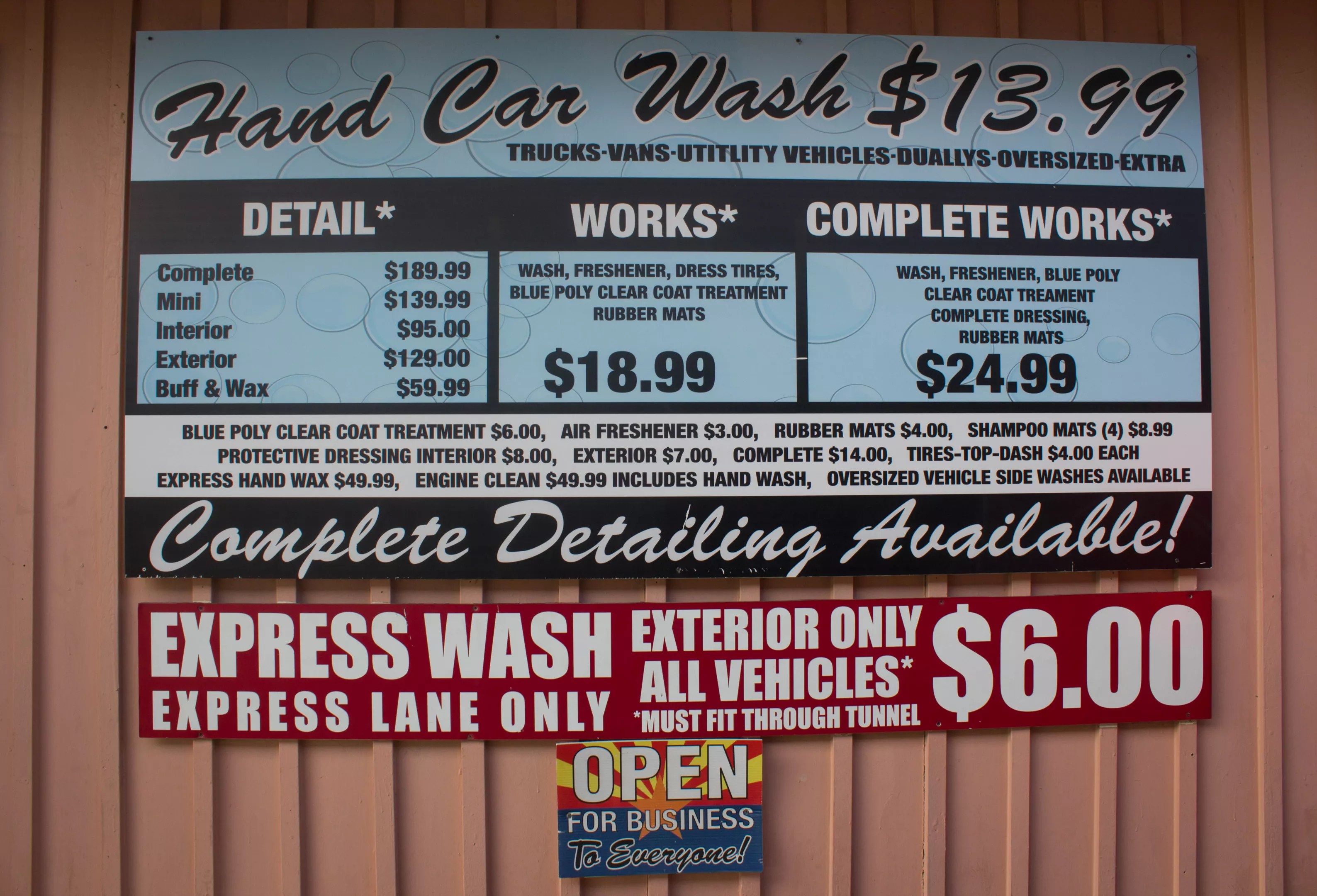 The exterior of Los Olivos’ dusky pink cinderblock building is covered with signs, one of which informs customers that removing egg from their car is not included in a standard wash and will cost extra.