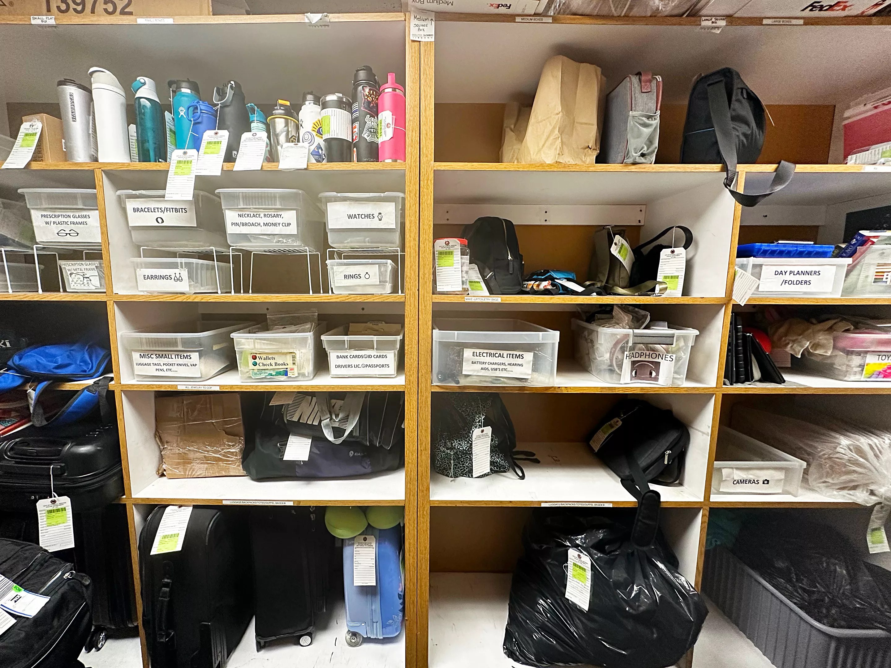 The lost-and-found is located at the rear of the Operations Building near the West Economy garage and Terminal 3 Sky Train station. It’s more of an overstuffed closet than an office. Shelves are piled high with plastic containers filled with watches, jewelry, eyeglasses, bank cards and phone changers. White ID tags hang from water bottles, briefcases and laptops. Suitcases are stacked in a corner next to hanging rods that hold coats and jackets for every season.