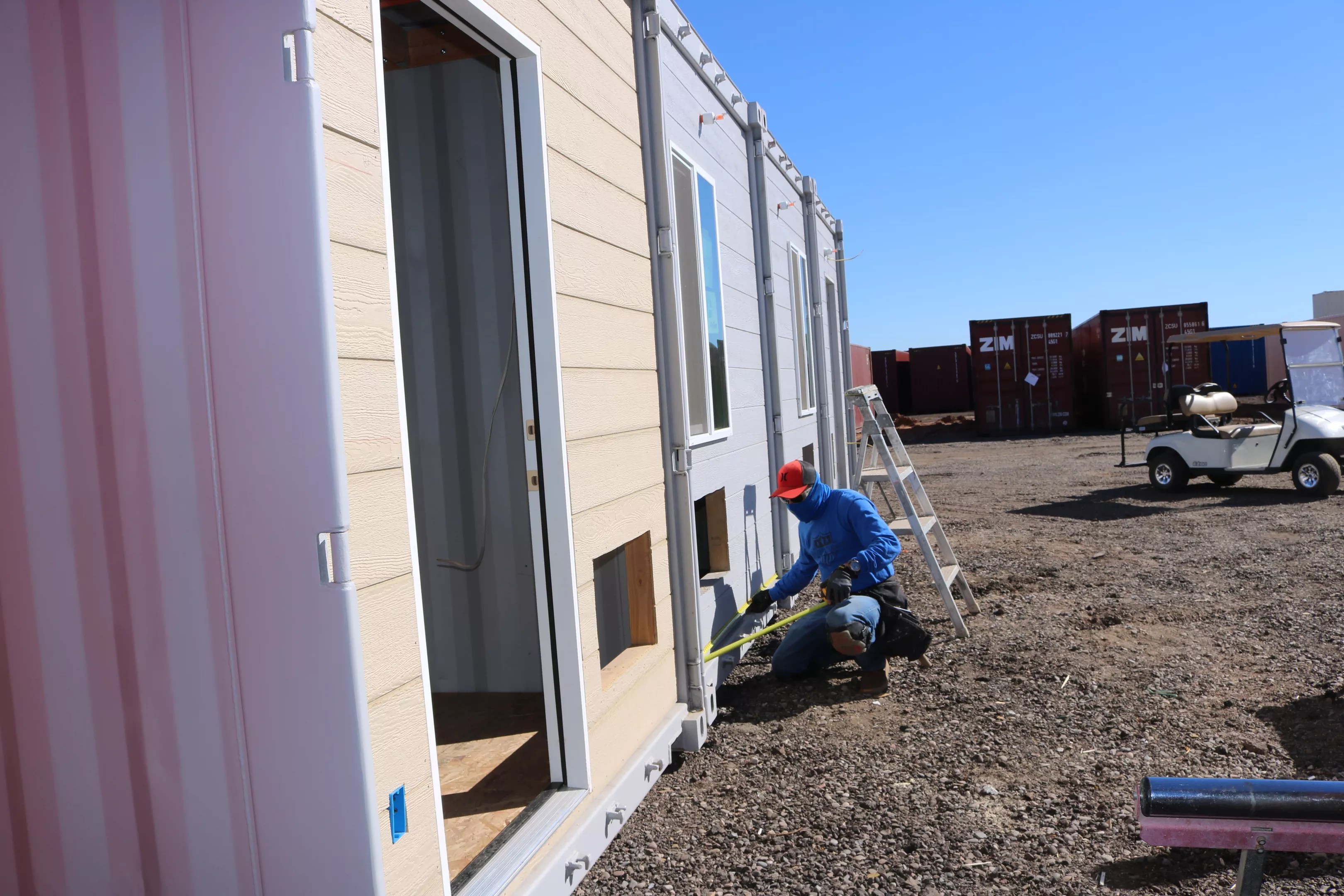 A worker is measuring material for The Jones Apartments, recycled shipping container homes built by Crosthwaite Custom Construction in Phoenix, Arizona.