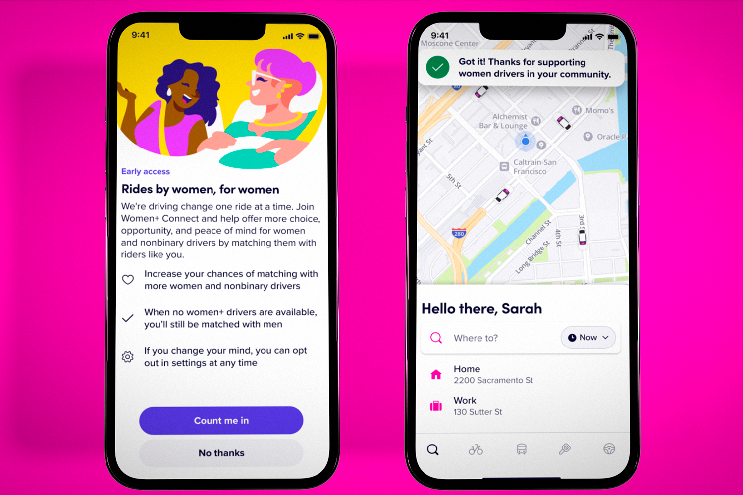 However, the Women+ Connect option does not guarantee that women and nonbinary drivers and riders will be paired for every ride.