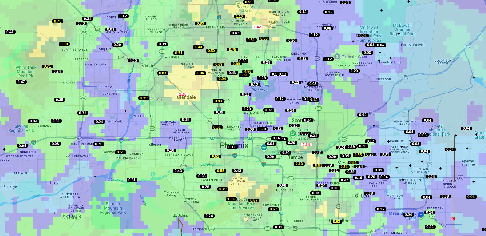 Areas of northwest Phoenix got from a half-inch of rain to nearly an inch and a half by Desert Ridge.