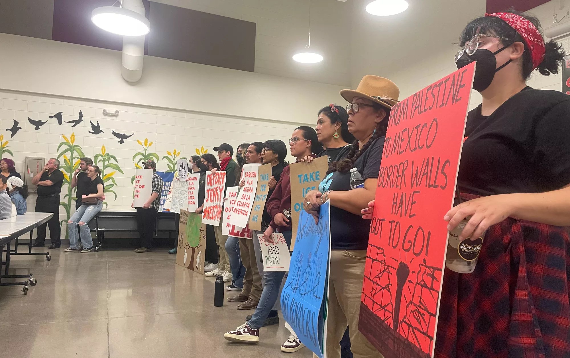 Around 10 people stood in the back of the school’s lunch room holding protest signs, including one that read “Deport Jerry Sheridan.” However, that isn’t uncommon for these meetings. In the fall, before the last monitor meeting under former Sheriff Russell Skinner, organizers protested against Sheridan and Proposition 314.