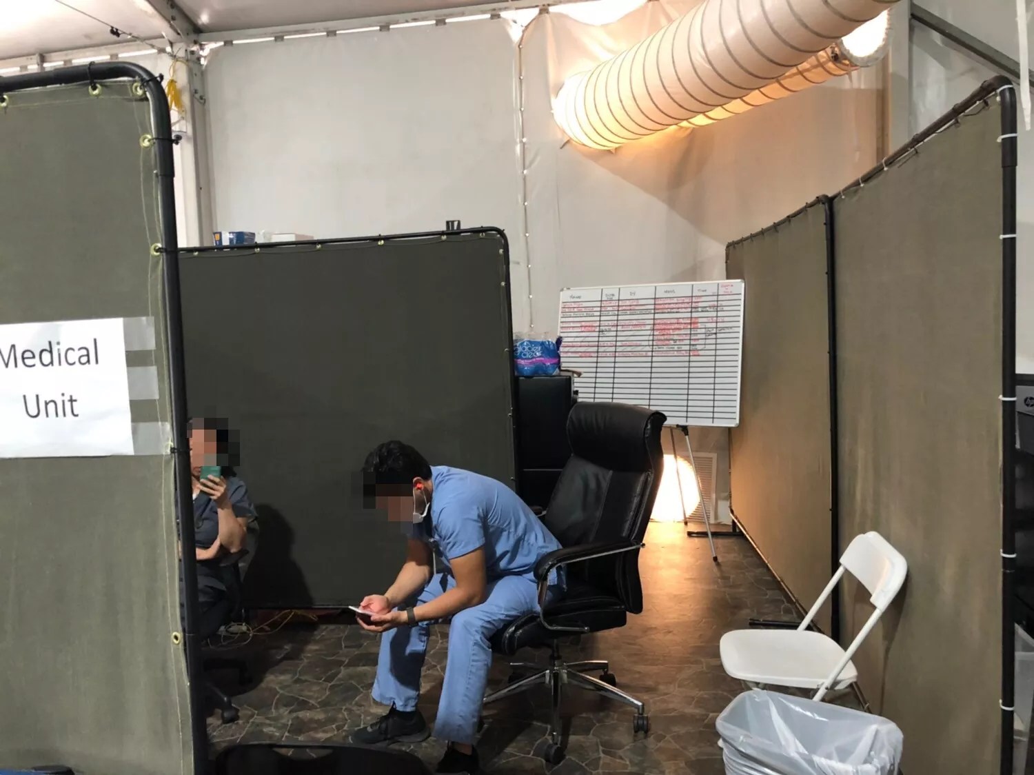 Health care professionals sit in the facility, awaiting incoming migrant family arrivals.