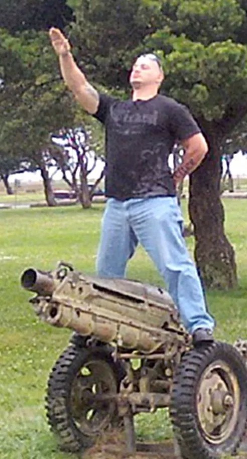Accused murderer and neo-Nazi Travis Ricci, sieg heiling atop a howitzer.
