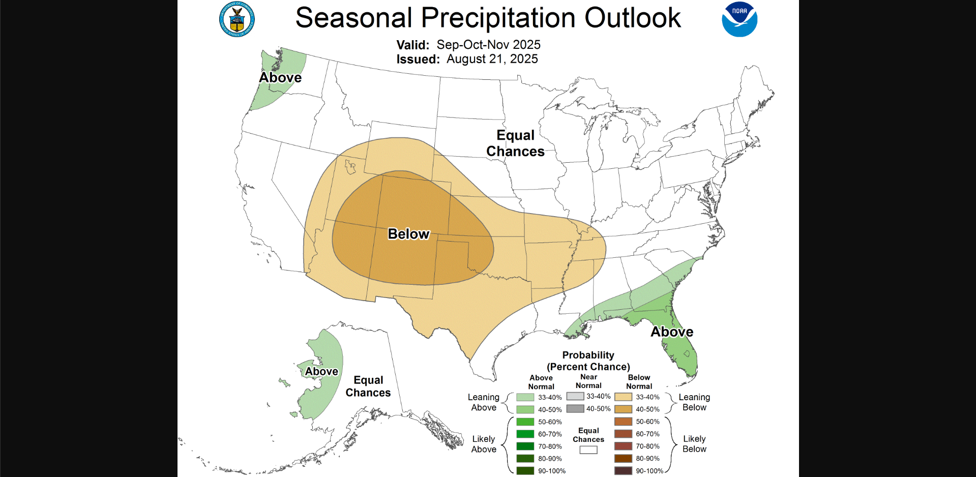 The NWS’s Climate Prediction Center projects above-average temperatures and below-average rainfall across the Valley for September, October and November. The northeastern corner of the state has even stronger chances of higher-than-normal temperatures.