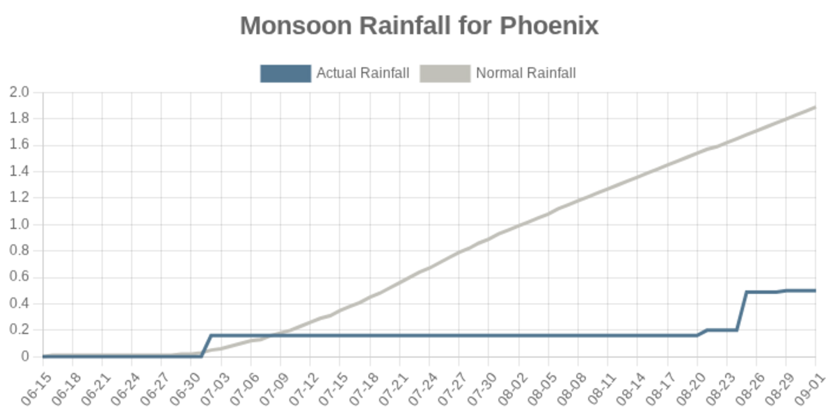 So far this monsoon, total rainfall counted at Phoenix Sky Harbor International Airport, where the NWS takes its measurements, has been only half an inch. More than half of that total – 0.29 inches – fell during the massive thunderstorm that hit the Valley on Aug. 25. From 1991-2020, according to NWS data, normal monsoon rainfall is 1.89 inches.