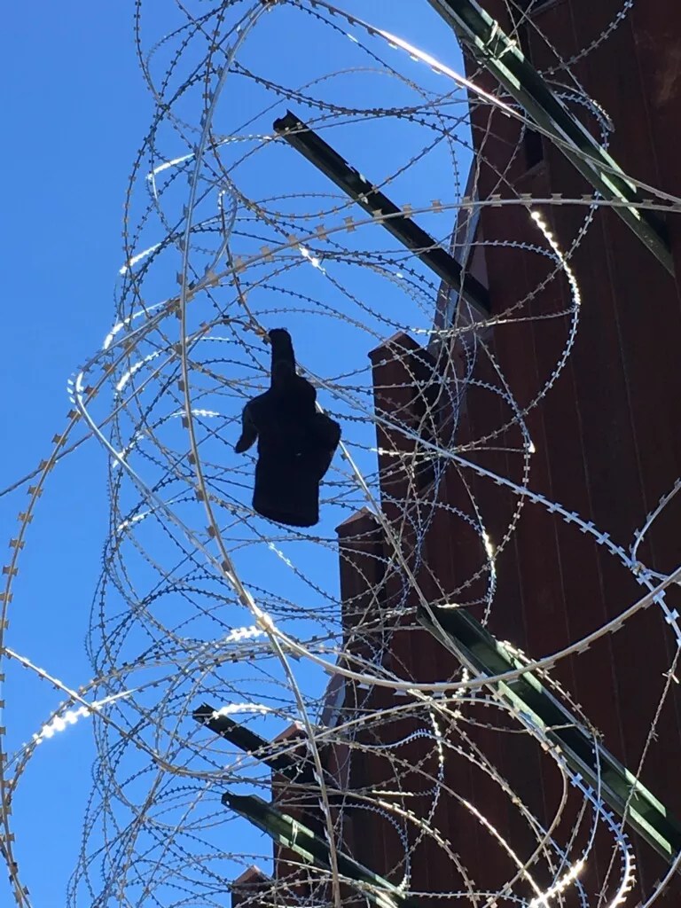 Santa Cruz, a naturalized U.S. citizen who has lived in Nogales for most of his life, has seen climbers scale the wall from time to time. Most recently, he saw a jumper get stuck in the concertina wire. He pointed to a tangled bunch of the wire on the fence across from his property, a single glove dangling on a barb.