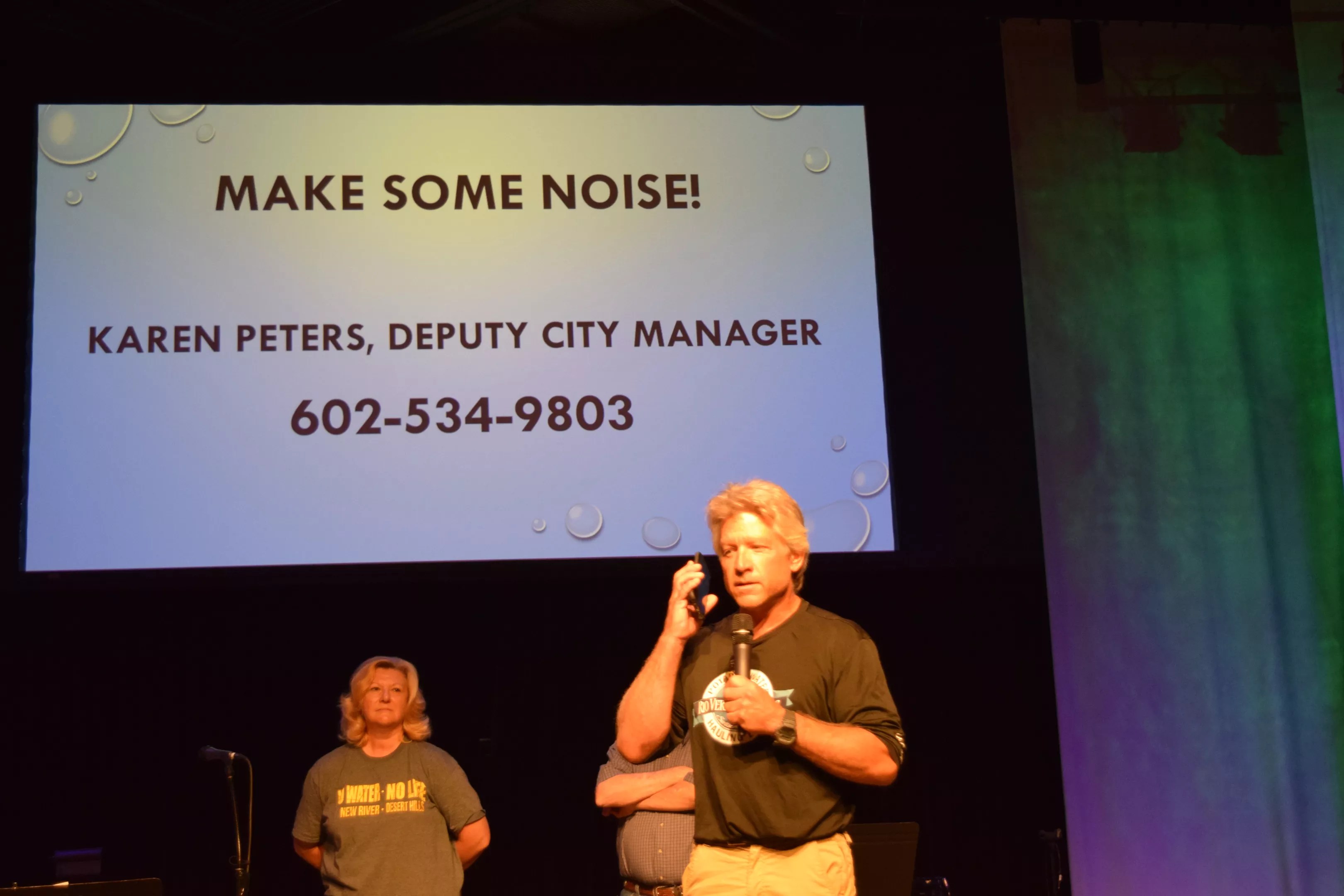 John Hornewer, the owner of Rio Verde Water Hauling, leaves a voicemail for a Phoenix deputy city manager on stage in front of hundreds of New River and Desert Hills residents.