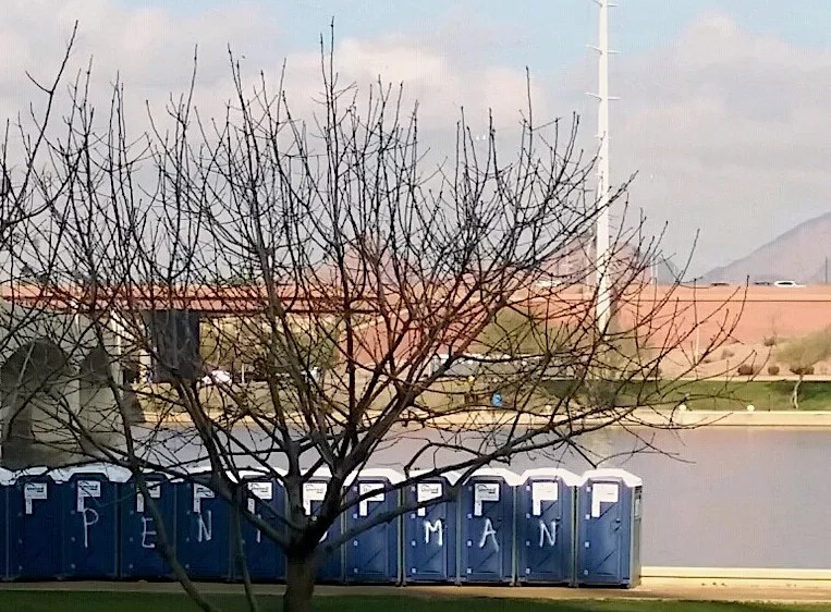 Shomer’s arrest in Phoenix followed weeks of publicity surrounding the graffiti tags. The words “Penis Man” scrawled with spray paint had appeared on numerous buildings and objects – mainly in Tempe near Arizona State University – since at least late November. In the last couple of weeks, the “Penis Man” tags showed up on high-profile locations like the Tempe municipal building, historic Hayden Flour Mill, the landmark “A” on Hayden Butte, and porta-potties at the Tempe Town Lake.