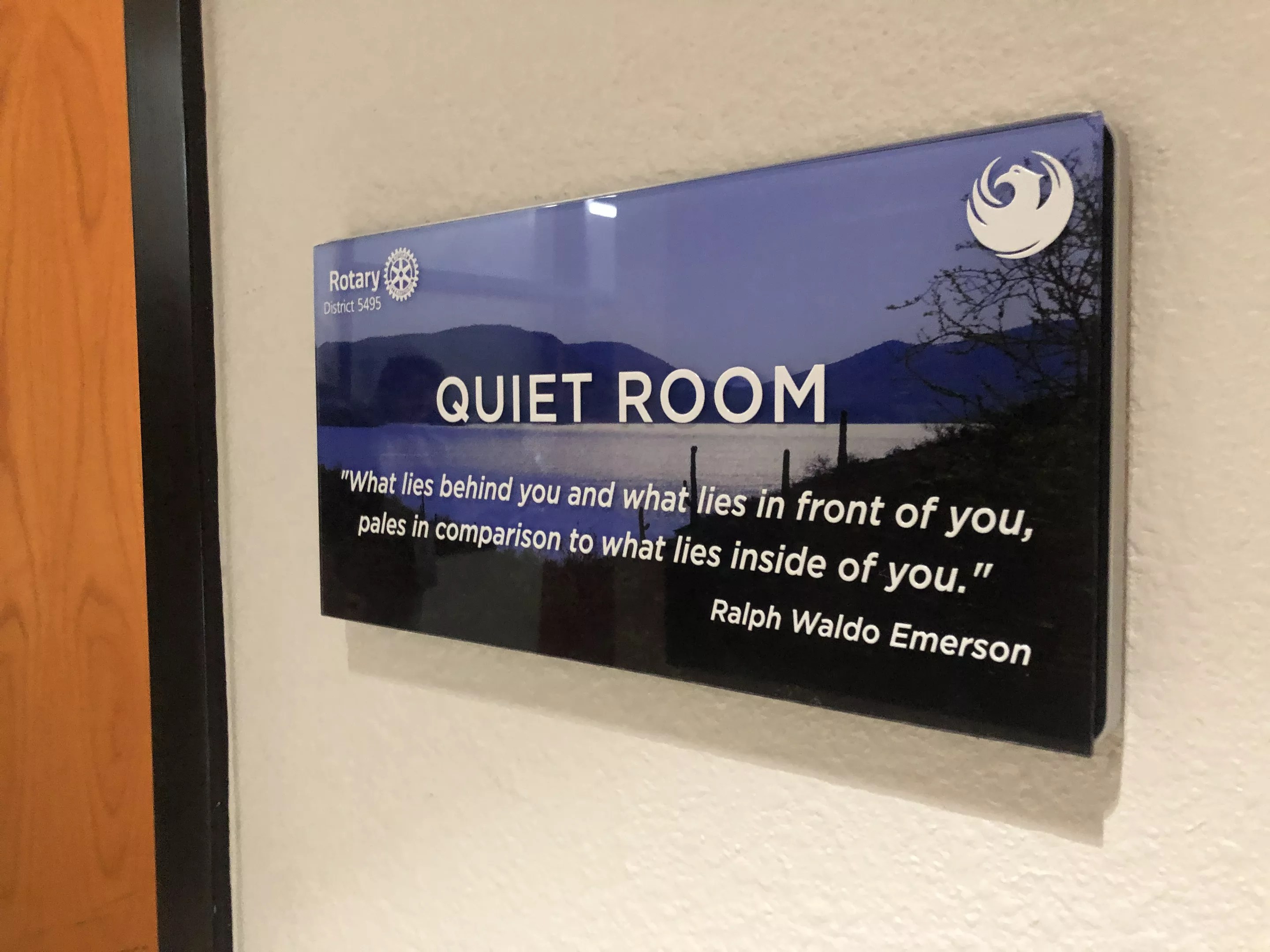 A plaque by the door of the new quiet room features a quote from Ralph Waldo Emerson.