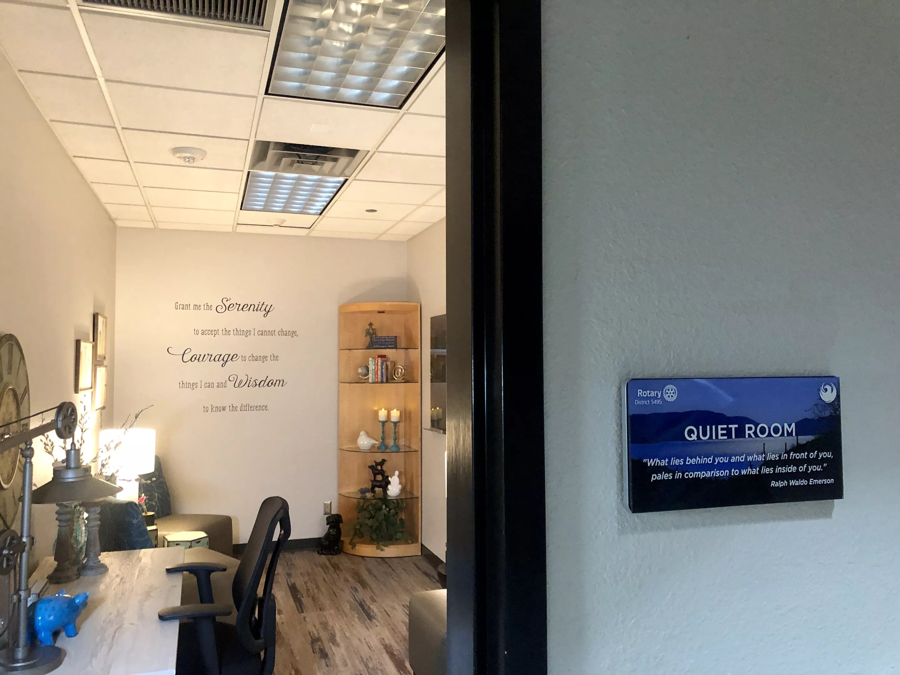 A plaque by the door of the new quiet room features a quote from Ralph Waldo Emerson.