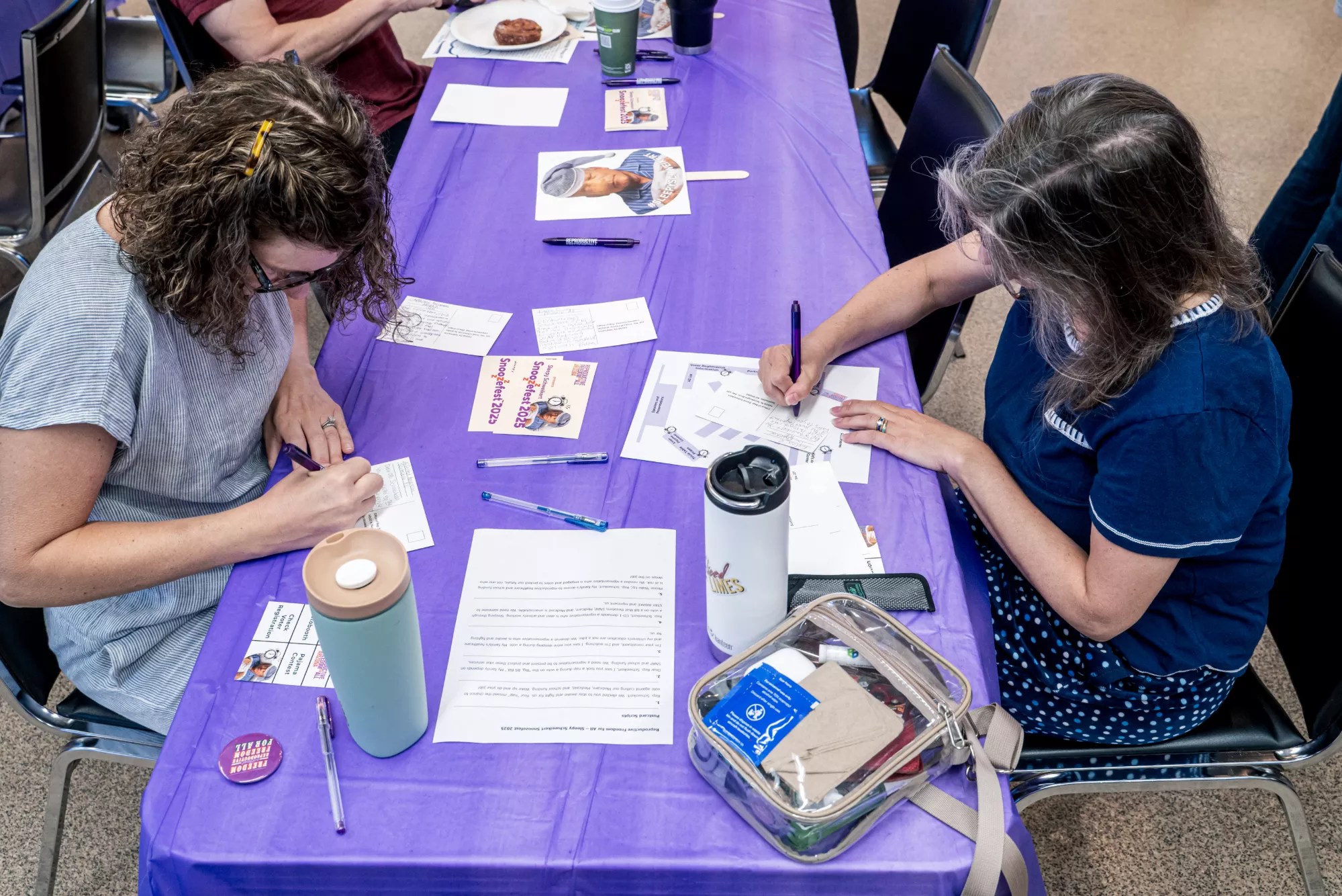 Saskia Elkstrom (left) and Karen Caggiano slog away crafting messages on a pile of postcards addressed to Schweikert.