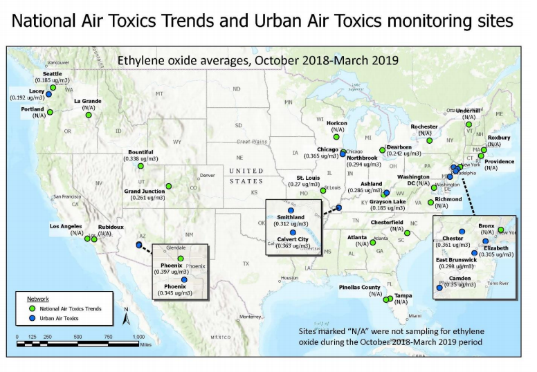 Both measured well above the national average of 0.297 micrograms of ethylene oxide per cubic meter.