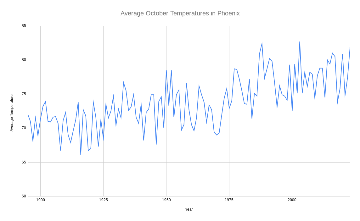 Last year, the average temperature in October was 81.9 degrees – the third highest ever, according to monthly average temperatures reported by the National Weather Service. The month was hotter in Phoenix only in 2003 (82.7 degrees) and 1988 (82.4 degrees).