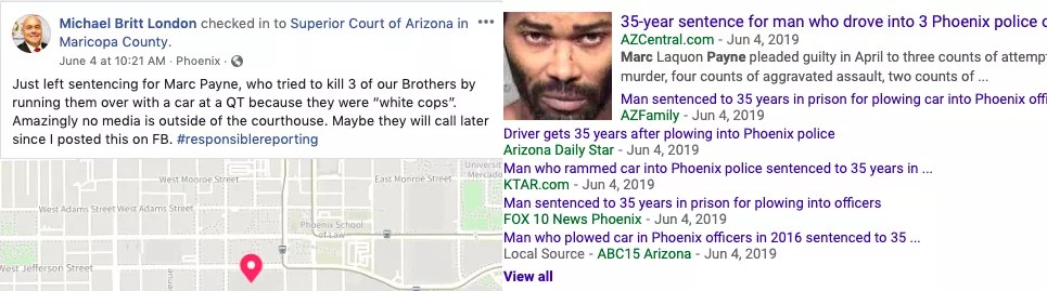One of his most recent posts, however, does attempt to paint the media as irresponsible for failing to report on the sentencing of Marc Payne, who is accused of hitting three Phoenix police officers with a car. But as a quick Google search shows, dozens of local news outlets did cover Payne’s sentencing.