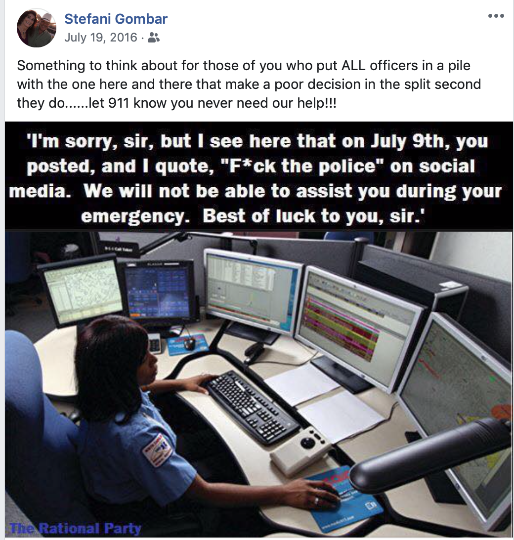 “Something to think about for those of you who put ALL officers in a pile,” wrote Stefani Gombar alongside a post of a 911 dispatcher refusing to help someone in an emergency because that person had once criticized the police.