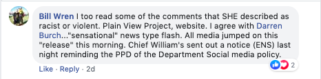 “Chief Williams sent out a notice (ENS) last night reminding the PPD of the Department’s Social media policy,” wrote someone going by the Facebook name “Bill Wren.”
