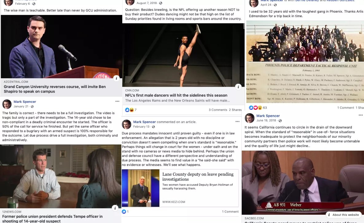 Some of Spencer’s other posts question the NFL for allowing male dancers, defend a police officer who shot a 14-year-old, referred to Phoenix police as a “gang,” and defended a deputy under investigation for sexual harassment. He has also expressed support for Ben Shapiro, a conservative political commentator and provocateur who has attacked Muslims, women, transgender people, and homosexuals.