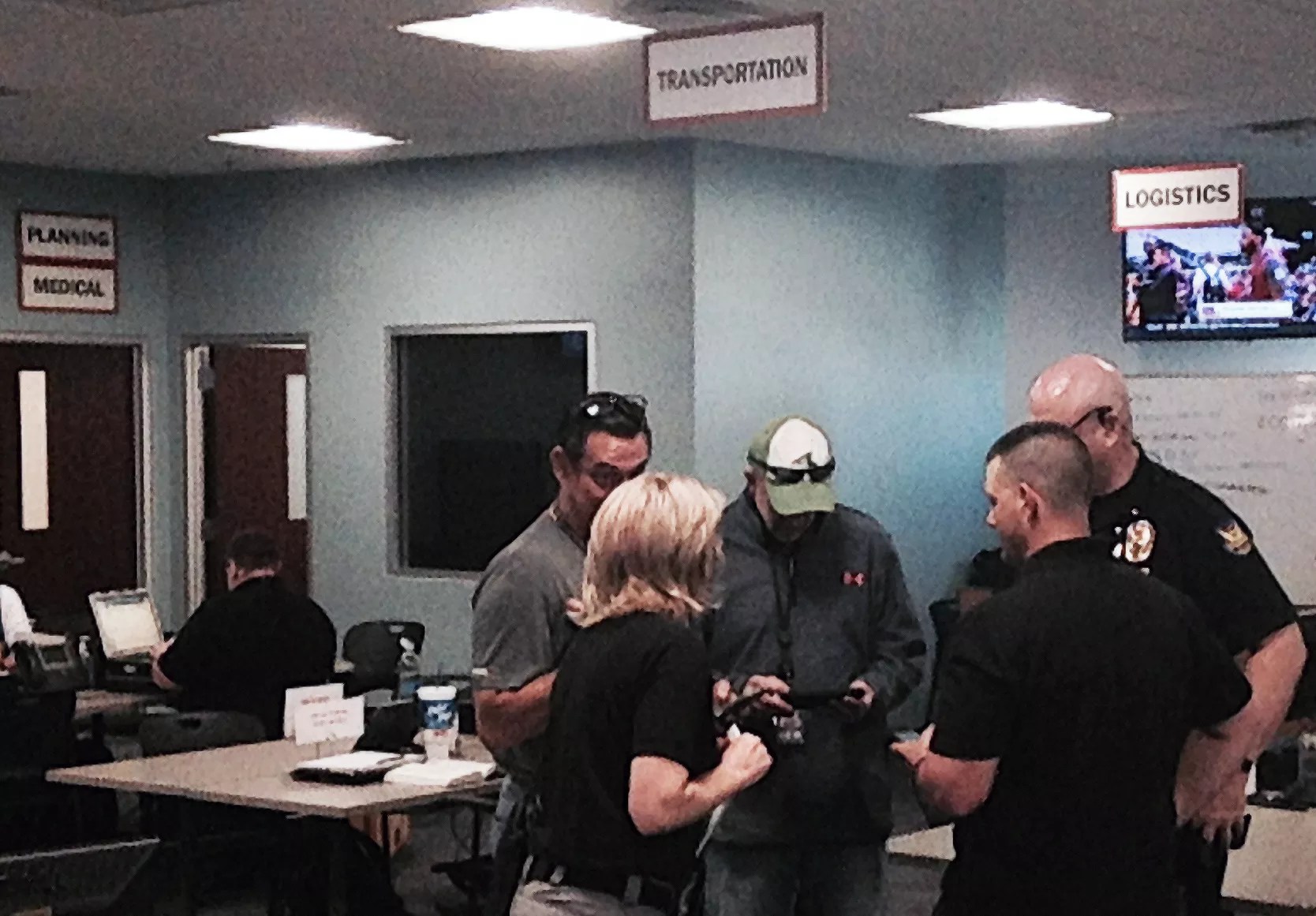 They huddled in teams around tables labeled communications, transportation, aviation, logistics, and public information. Two tables had paper tents that labeled the work “intel.”