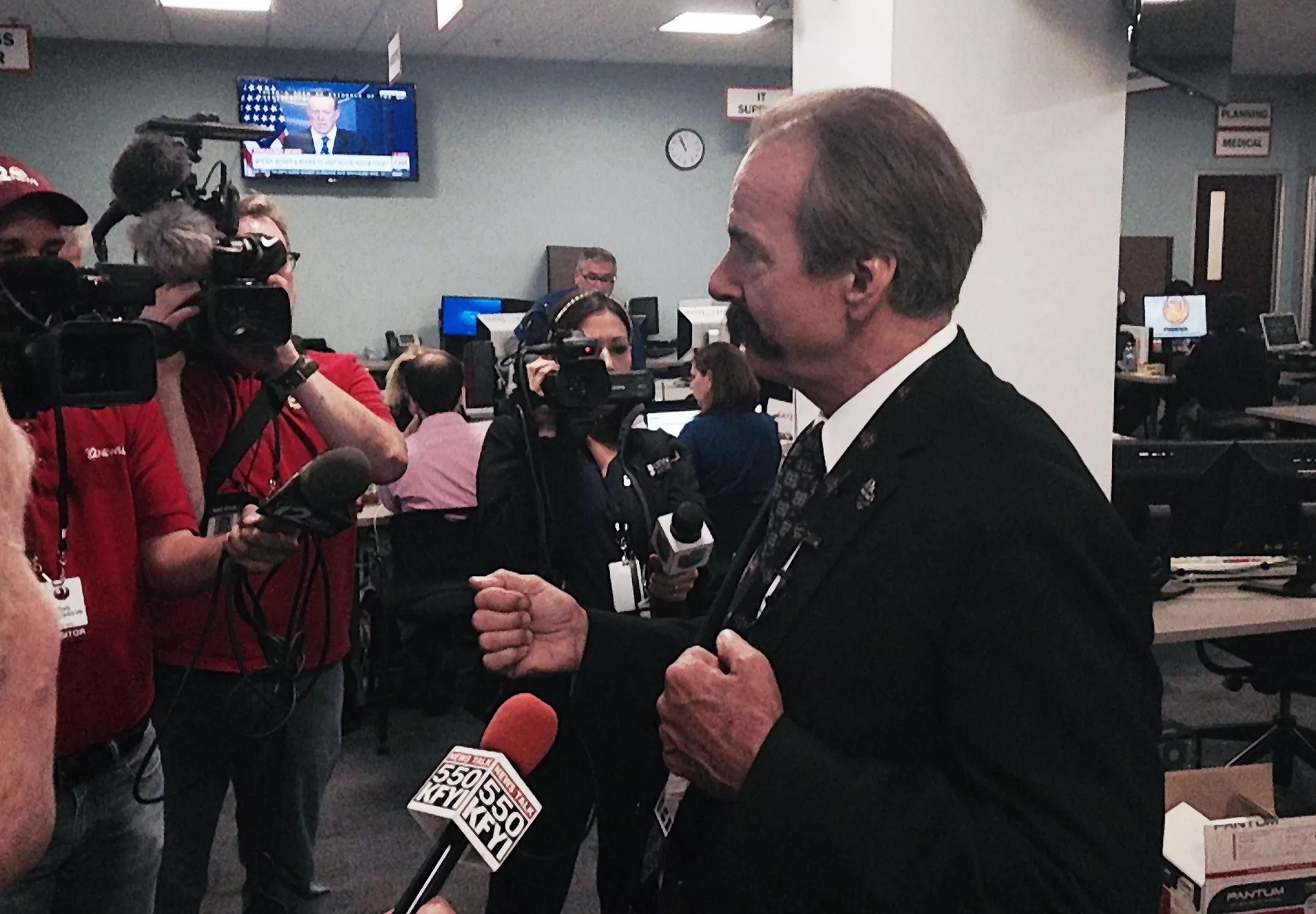 Phoenix Assistant Fire Chief Kevin Kalkbrenner briefs reporters Friday on preparations inside the Emergency Operations Center for NCAA Final Four weekend.