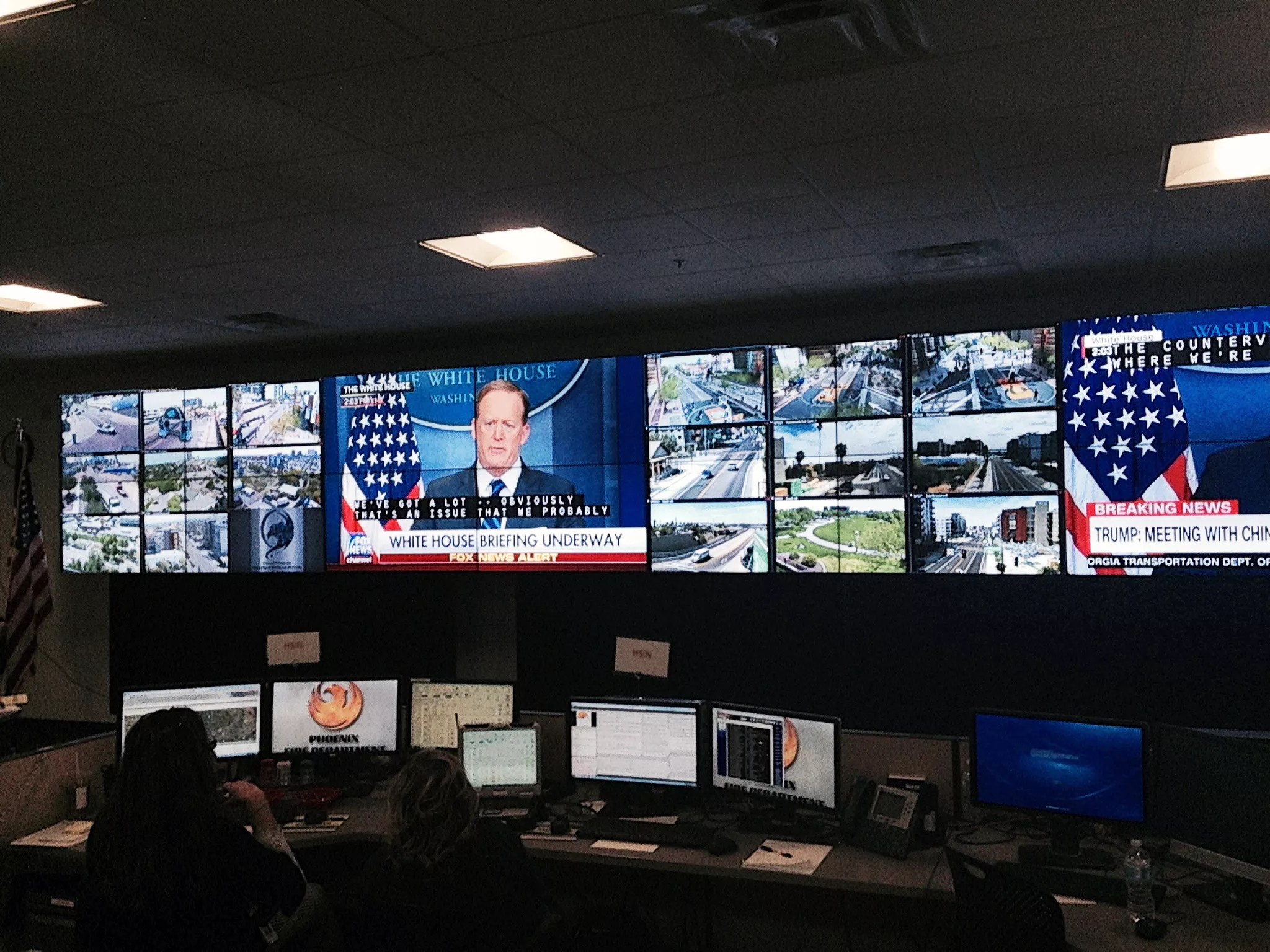 Looming over the entire hub of activity beamed five giant plasma TV screens. Two showed the latest redirect coming from presidential spokesman Sean Spicer, and the others featured spliced shots of maps and live feeds from street cameras.