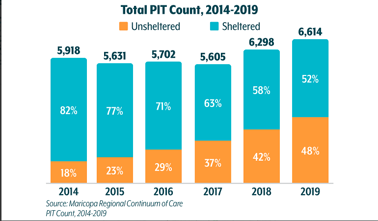 The number of unsheltered people on a single night in Maricopa County eclipsed 6,600 in 2019.
