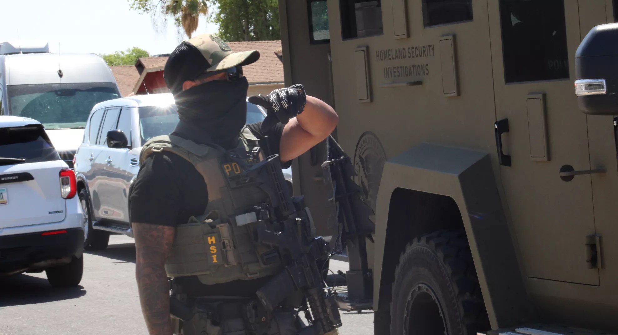 That convoy then drove roughly a mile west, flooding a residential neighborhood near North Street and between 69th and 71st avenues. The vehicles surrounded a house, located at 7007 W North Ave., and appear to have deployed the battering ram to enter. Heavily armed HSI agents, in body armor, helmets and masks and carrying riot shields, entered the house.