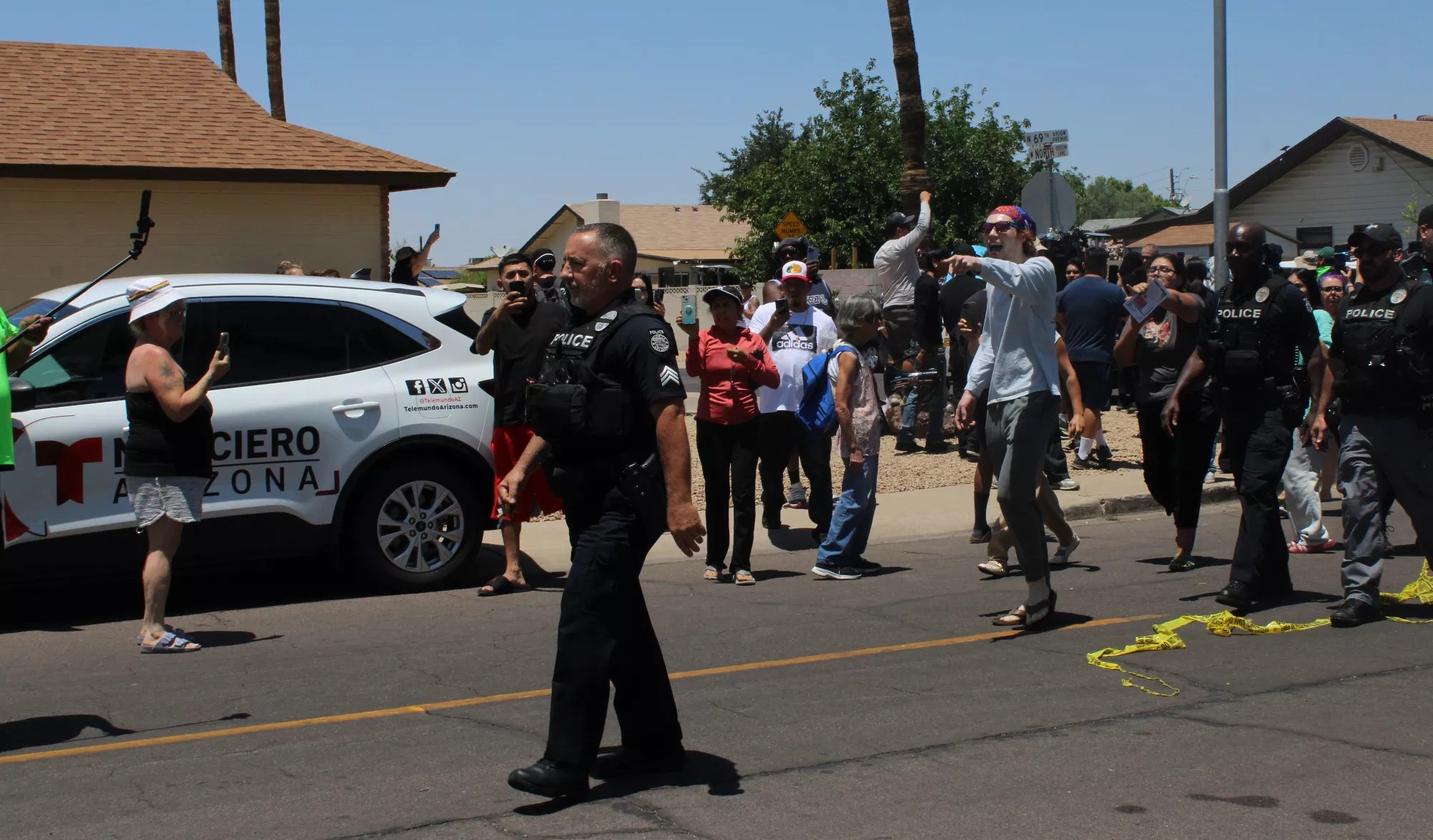 Peoria police stuck around after the raid, and the neighborhood was no longer quiet. About 50 people gathered to watch and protest from a distance on the east side of the street.