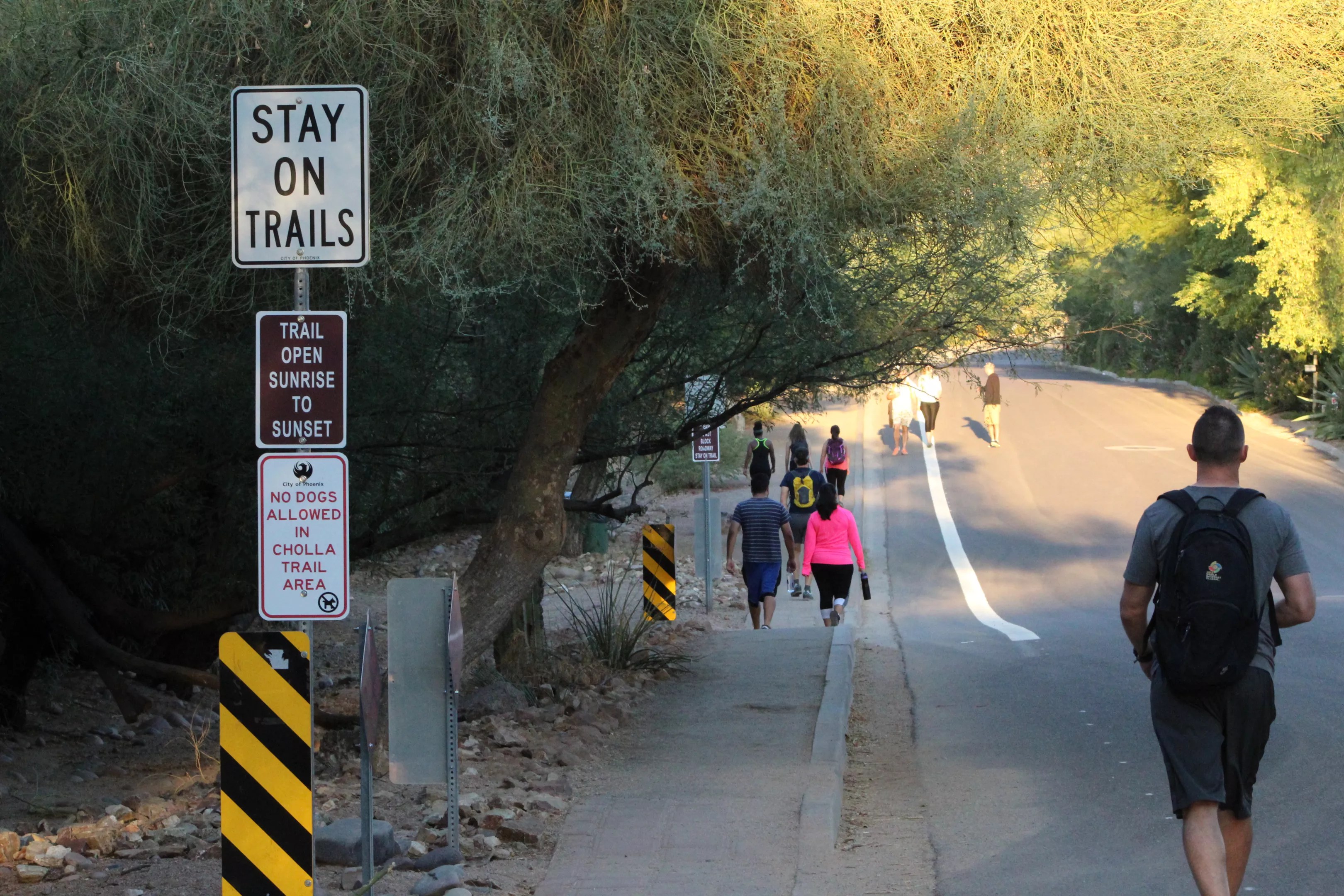 Hikers walking along Cholla Lane to and from the trailhead of Cholla Trail.